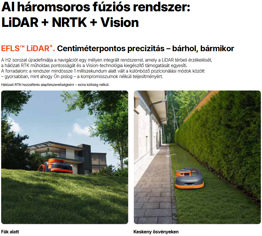 • LiDAR, Network RTK és Vision technológiák együtt biztosítják a kiemelkedő helymeghatározást – még fák alatt vagy szűk átjárókban is.