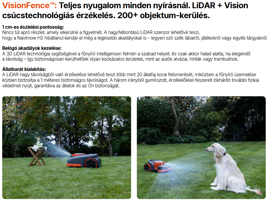 • A VisionFence™ több mint 200 akadályt képes felismerni ±1 cm pontossággal, így elkerüli a kis tárgyakat, játékokat vagy akár háziállatokat is.