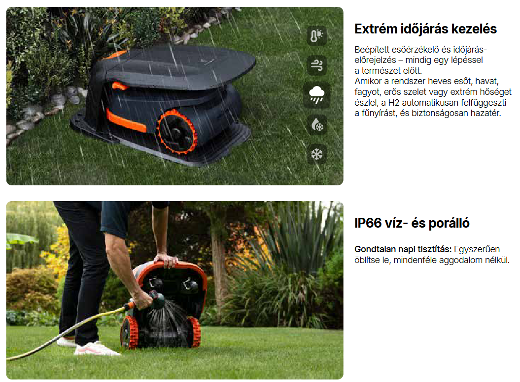 • IP66 víz- és porállóság, így a robot ellenáll az esőnek és a portól sem kell tartani.