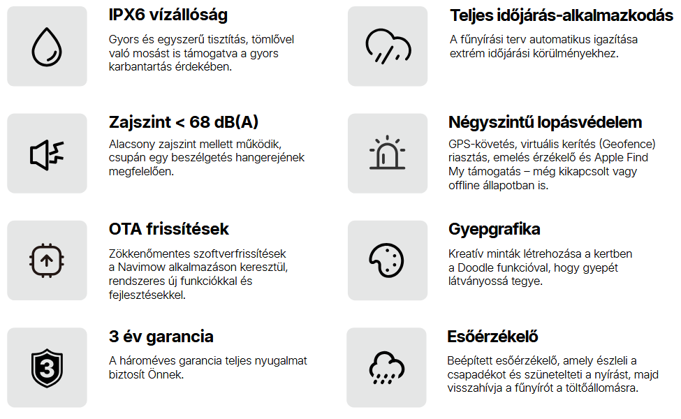 A Navimow H2 robotfűnyíró a következő generációs kertápolást hozza el otthonodba: fejlett navigáció, automatikus térképezés, akadályfelismerés és precíz mozgás kombinációja teszi ideálissá komplex, nehezen kezelhető kertekhez.