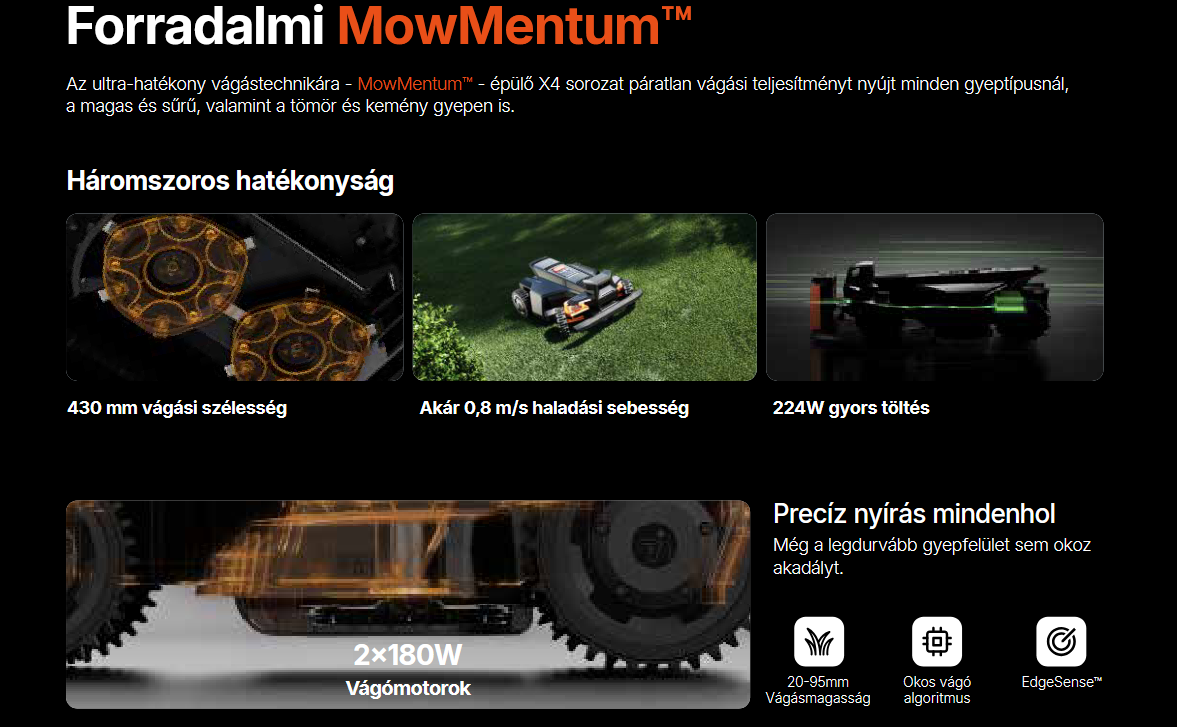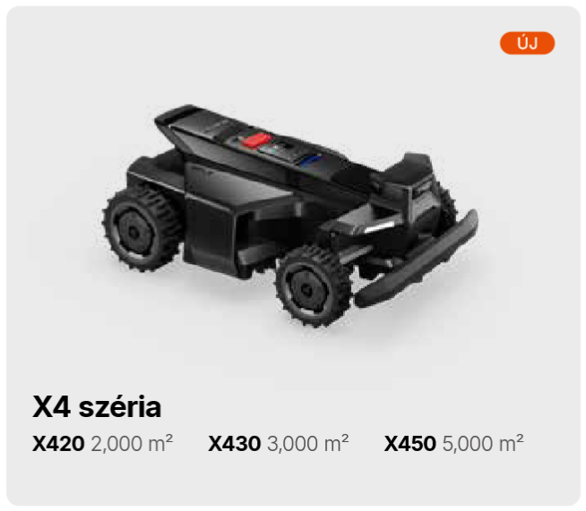 A Navimow X4 egy prémium kategóriás robotfűnyíró sorozat nagy kiterjedésű kertekhez, amely az Xero-Turn™ AWD négykerék-meghajtással, intelligens navigációval és automatikus térképezéssel gondoskodik a tökéletes gyepápolásról. Képes akár 84 % (40°) emelkedőn is működni, dupla 17" vágótárcsával és Al alapú 360° akadályelkerüléssel dolgozik, így biztonságosan és hatékonyan lenyírja a füvet nagy, bonyolult terepeken is. Az automatikus feltérképezés és a NRTK precíziós helyzetmeghatározás révén egyszerű a telepítés és vezérlés.